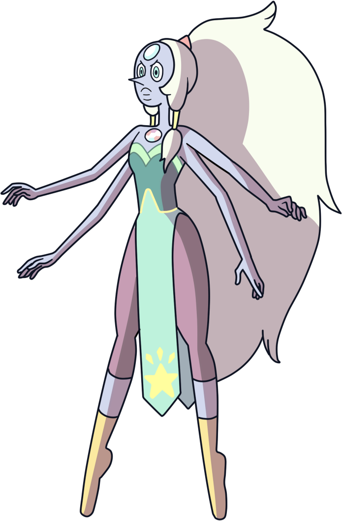 blanco crema atado con una coleta naranja y sus cabellos frontales están amarrados con dos coletas largas amarillas su piel es color malva, ojos celestes incandescente y cuatro brazos delgados en "El retorno" su ropa cambia debido a que perla se regenera en steven el espadachín sus gemas están ubicadas en su frente y en su pecho ambas se transforman en ópalosArma: